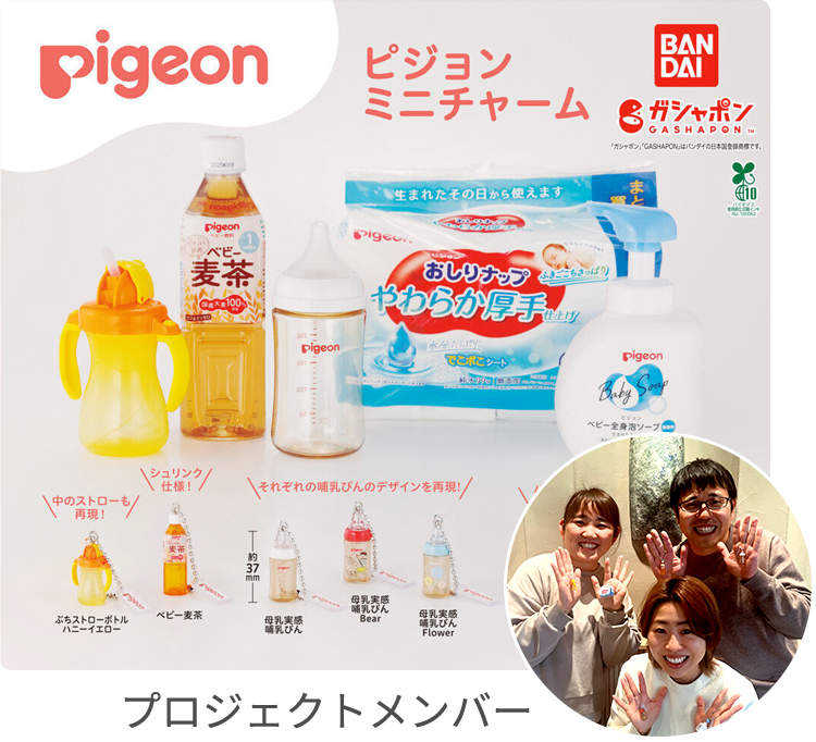 ピジョンでは、「挑戦できる組織風土」の醸成を目指し、社員が失敗を恐れず挑戦することを応援するPigeon Frontier Awards (PFA) 制度を運用しています。2025年9月、本プロジェクトから生まれた「ピジョンミニチャーム」を株式会社バンダイが展開する「ガシャポン®」として発売しました。本プロジェクトは「育児中であるかどうかにかかわらず、日常生活の中で赤ちゃんのいる暮らしを身近に感じてほしいという想い」から始動しました。実物の細部まで忠実に再現した商品は、発売直後からSNSを中心に大きな反響をいただき、世代を超えてピジョンブランドを身近に感じてもらう機会となりました。ピジョングループは、これからも社員一人ひとりの想いを原動力に、存在意義の実現に向けて取り組んでいきます。
