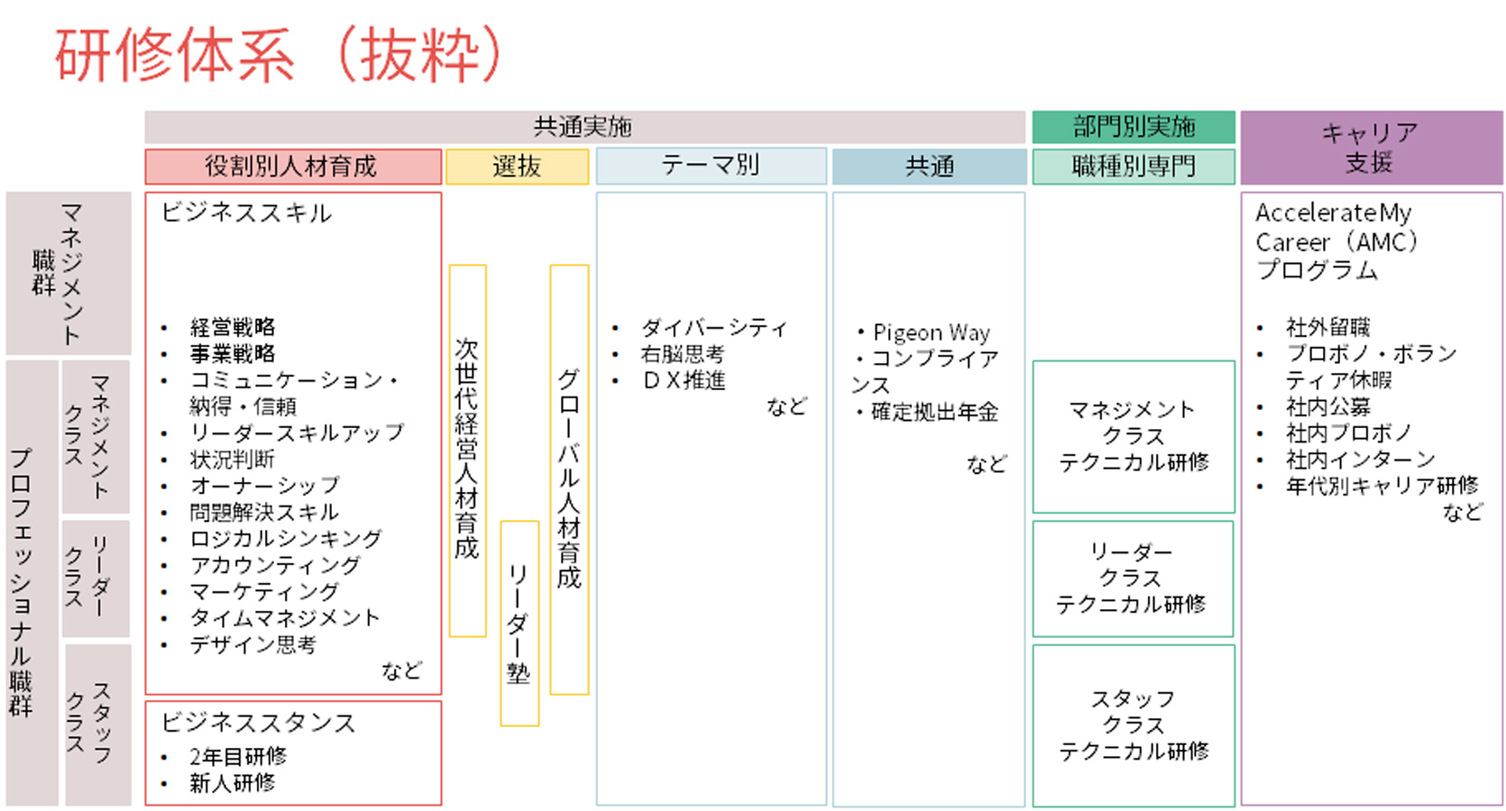 目指すべき姿や獲得すべき知識を可視化するため、役割や職種に応じた「研修体系」を整備しています。