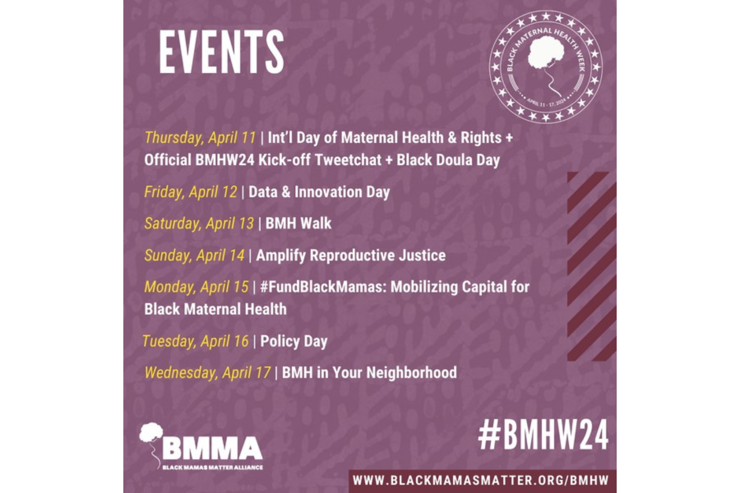 毎年4月11日から17日までは「黒人母体健康週間」とされています。これは黒人女性たちの声を広く届け、黒人コミュニティが主導する妊産婦の健康支援活動に光を当て、「生殖と出産の公正さ」という価値観を広めることを目的としています。